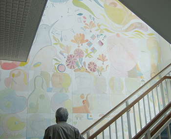 このフレスコ画は、高さ7m・横5.4mの壁面に、 小鳥・花・時計・人の顔などが透明感のある明るい 色調で描かれていて手前の階段を上り下りしながら 間近に見られる様になっています。 「BONJOUR」という朝のさわやかな雰囲気は、 多くの人々や親子のふれあいの場を飾る場所に ぴったりです。