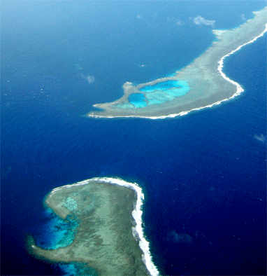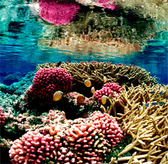 石灰石のもとは、暖かい海に生きるサンゴです。 サンゴは成長しながら海中の二酸化炭素をからだにとりこみ、 石灰質のカラを造ります。 サンゴのカラが積もり積もって巨大になったのが、サンゴ礁です。
